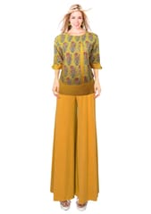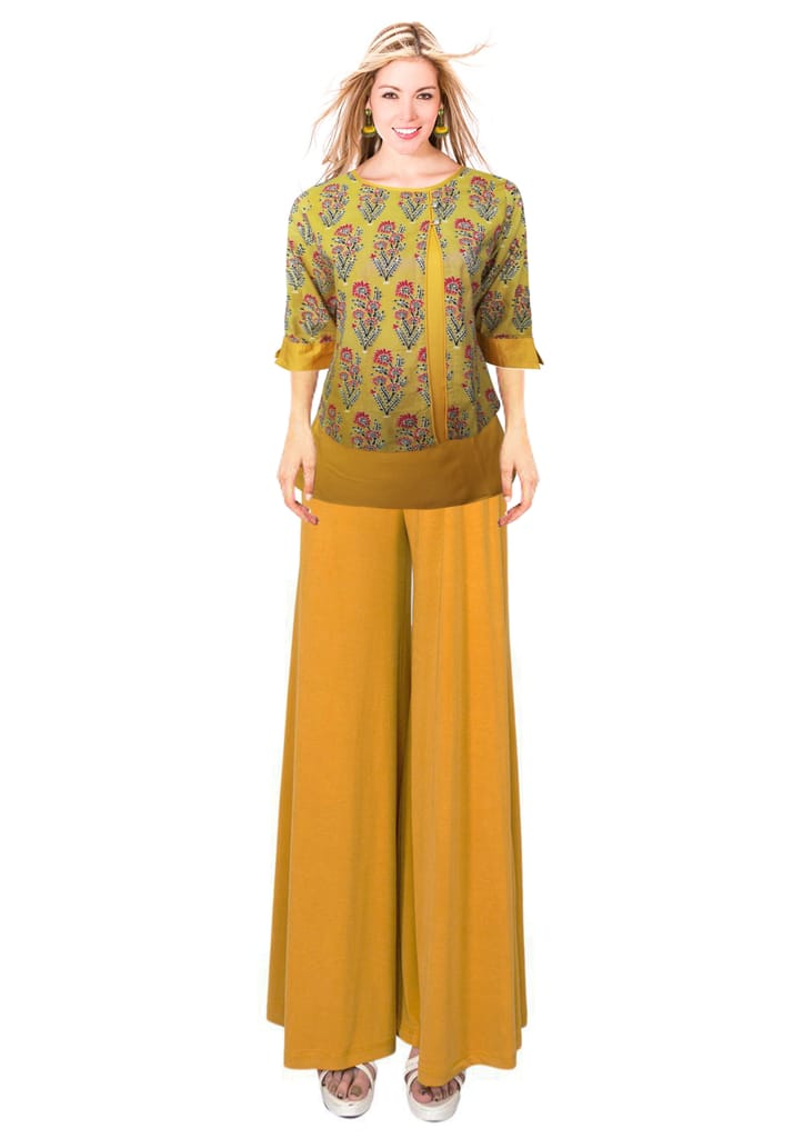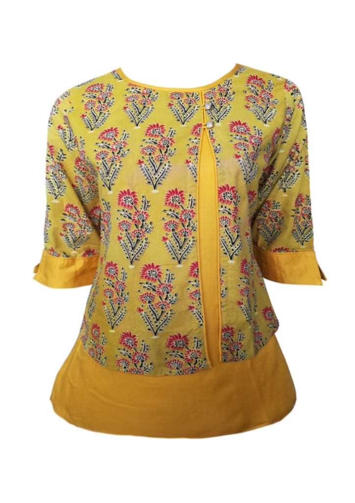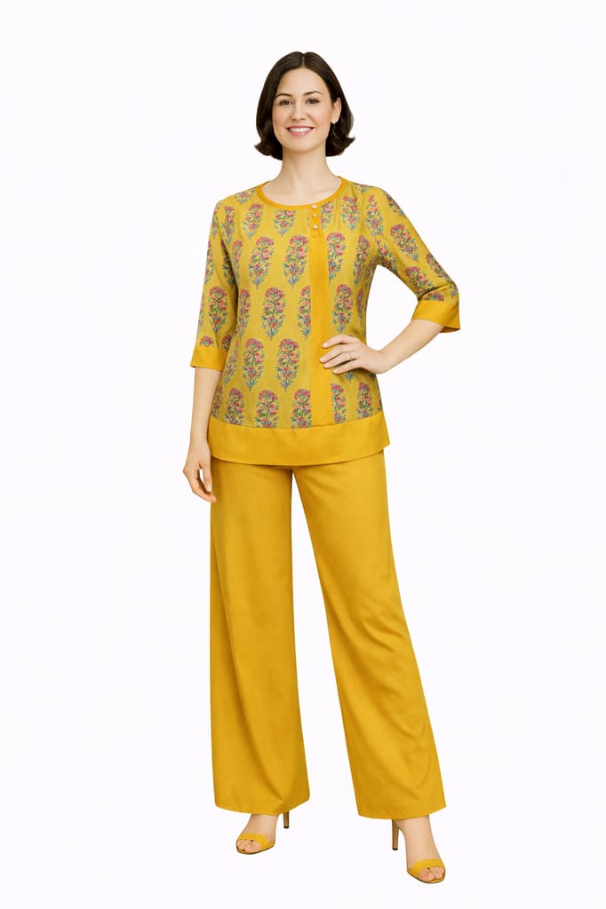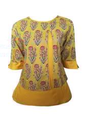 Elegant Mustard Hand block Cotton Ajrak and Rayon printed kurti, has a round neck with contrast piping acessorized with golden buttons, three quarter sleeves with contrast piping on cuff, side slits.