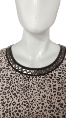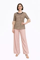 Stylish Leopard printed blush pink and choclate brown top, has a round neck with contrast velvet ribbon piping and exquisite hand embroidery, three quarter sleeve with chiffon ruffles and contrast piping, has a slightly rounded hemline.