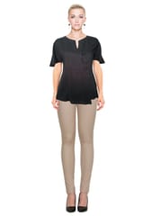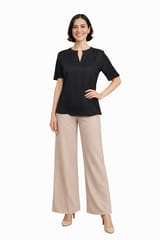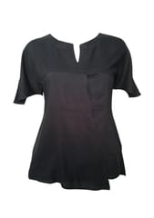 Stylish Black solid top, has a notched round neck, short tapered sleeves, front asymmetric flap, side slits.