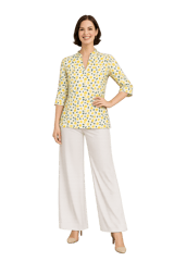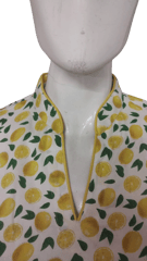Summer Fresh Yellow and Offwhite Lemon printed top, has a mandarin V neck with contrast piping, three quarter slightly flared sleeve with contrast piping, side slits.