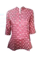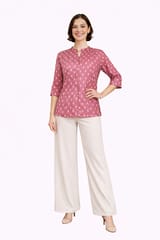 Sophisticated Choco brown and white Floral printed shirt with pintucks, has a mandarin V collar, front loops and matching buttons, three quarter slightly flared sleeves with pintuck detailing, side slits.