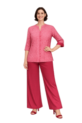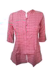 Stylish Red and White printed Shirt with pin tucks detailing, has a mandarin V collar, front loops with matching buttons, three quarter slightly flared sleeves with pintuck detailing on cuff, side slits.