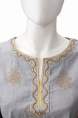 Elegant Grey and golden foil printed kurti with gota patti detail, has a notched round neck, three quarter sleeves, side slits. Has an soft inner voile(mulmul) lining.