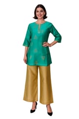 Green and golden foil printed kurti with gota patti detail, has a notched round neck, three quarter sleeves, side slits.