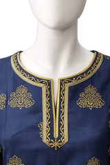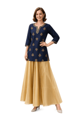 Beautiful Navy blue and golden foil printed kurti with gota patti detail, has a notched round neck, three quarter sleeves, side slits. Has an soft inner voile(mulmul) lining.