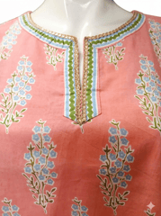 Pink printed cotton kurti with gota work, has a notched round neck, three quarter sleeves, side slits.