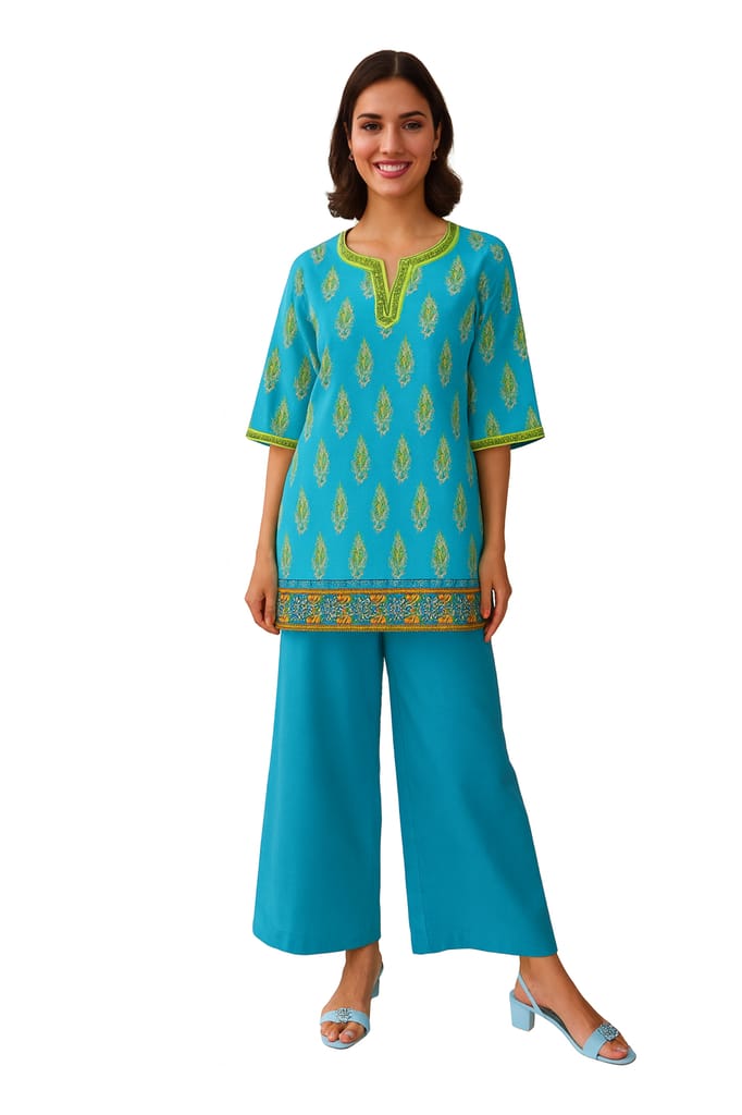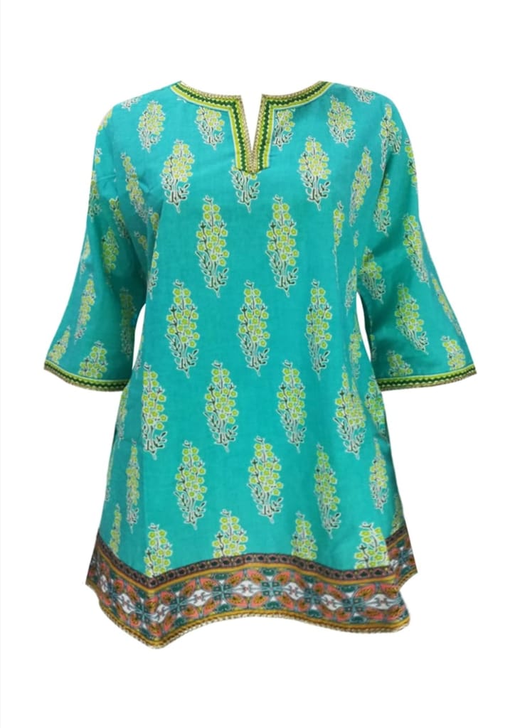 Turquoise printed kurti with gota work, has a notched round neck, three quarter sleeves, side slits.