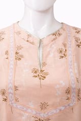 Summer peach-pink and golden foil cotton printed kurti with gota work, has a rounded mandarin collar, three quarter sleeves, side slits.
