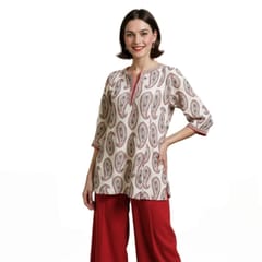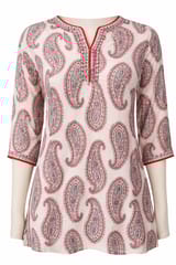 Stunning and elegant paisley pastel red and cream kurti in soft crepe, has a round neck with border and contrast dori piping , three quarter straight sleeves border with contrast piping, side slits.
