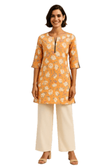 Floral pastel orange kurti in soft micro, has a round neck with contrast patti piping and silver buttons, three quarter sleeves with slit contrast patti, side slits.