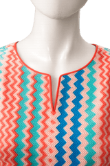 Zigzag pastel pink blue and green kurti in soft micro, has a round neck with contrast dori piping , three quarter sleeves with contrast piping, side slits.