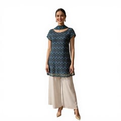 Acqua blue green zig zag printed chiffon kurti for a summer evening club or resort wear, has a soft cotton voile (mulmul) lining, a boat neck with hand embroidery, short sleeves, side slits.