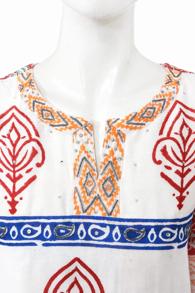 Exquisite and beautiful HandBlock Hand Embroidered printed Floral Kurta in pastel tone, has a notched round neck and a yoke, three quarter straight sleeves, has a inner soft cotton voile (mulmul) lining, side slits. Prints may vary as part of design.