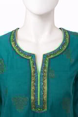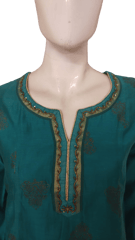 Elegant and stunning Chanderi Silk Green and Golden Foil printed kurta, has a soft cotton voile matching inner lining, round notched neck with hand embroidered and gota patti details on neckline, three quarter sleeves with hand embroidery and gotta patti on cuff, side slits.