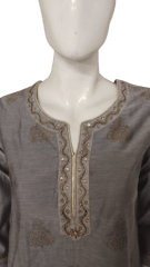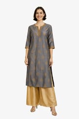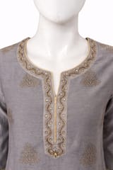 Elegant and stunning Chanderi Silk Grey and Golden Foil printed kurta, has a soft cotton voile matching inner lining, round notched neck with hand embroidered and gota patti details on neckline, three quarter sleeves with hand embroidery and gotta patti on cuff, side slits.