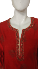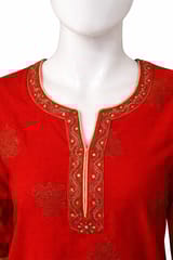 Elegant and stunning Chanderi Silk Red and Golden Foil printed kurta, has a soft cotton voile matching inner lining, round notched neck with hand embroidered and gota patti details on neckline, three quarter sleeves with hand embroidery and gotta patti on cuff, side slits.