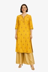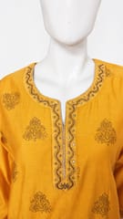Elegant and stunning Chanderi Silk Yellow and Golden Foil printed kurta, has a soft cotton voile matching inner lining, round notched neck with hand embroidered and gota patti details on neckline, three quarter sleeves with hand embroidery and gotta patti on cuff, side slits.