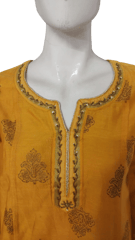 Elegant and stunning Chanderi Silk Yellow and Golden Foil printed kurta, has a soft cotton voile matching inner lining, round notched neck with hand embroidered and gota patti details on neckline, three quarter sleeves with hand embroidery and gotta patti on cuff, side slits.