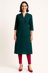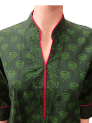 Forest green floral abstract printed kurta in handblock cotton, has a mandarin round V neck with contrast piping, three quarter sleeves and contrast piping, side slits.