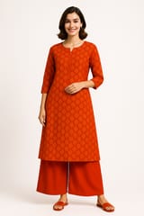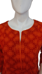 Red orange printed kurti in handblock cotton, has a round neck with contrast piping, three quarter sleeves and contrast piping, side slits.