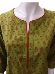 Olive Green floral printed kurti in handblock cotton, has a round notched neck with contrast piping, three quarter sleeves and contrast piping, side slits.