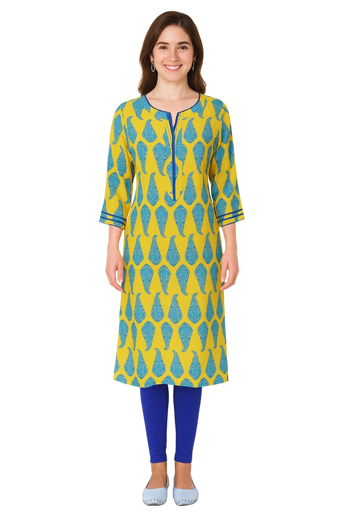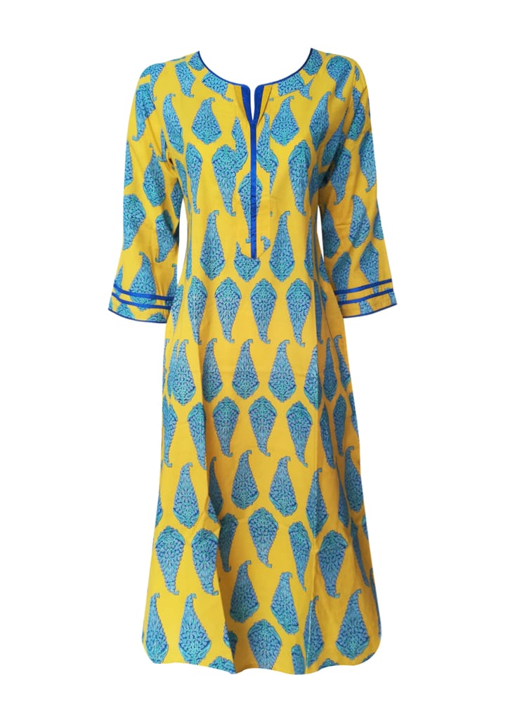 Yellow and blue printed kurta, has a notched round neck, three quarter sleeves, side slits.