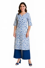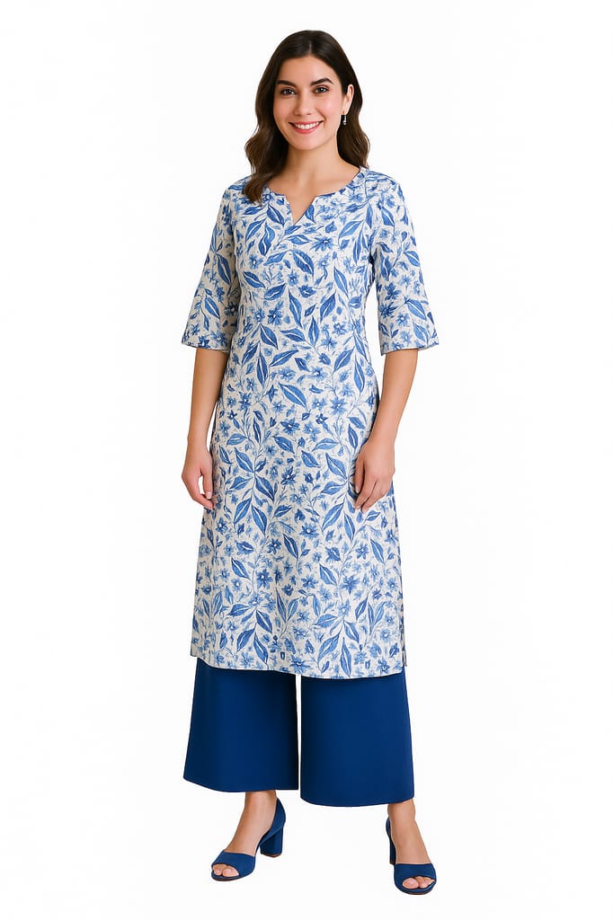 Elegant floral printed fine cotton linen kurta, has a round v neck , three quarter sleeves, side slits.