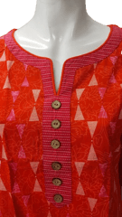 Stylish coral red printed kurta with back in solid matching color, round notched neck in contrast piping and border with button highlights, three quarter sleeves with border, side slits.