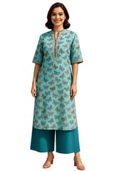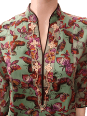 Lovely acqua green butterfly printed chiffon hand embroidered kurti with a soft cotton voile (mulmul) inner lining, has a mandarin V neck, contrast piping with floral hand embroidered border, flared sleeves, side slits.