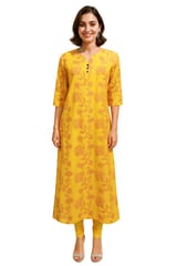 Must and red printed kurta, has a notched round neck, three quarter sleeves, side slits.