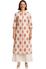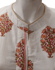 Elegant white and coral pink golden foil hand block printed kurta with floral motif, has a rounded mandarin collar, three quarter sleeves, front and side slits.