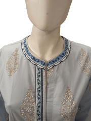 Elegant Grey blue floral silver foil hand block printed kurta in beautiful floral motif, has a rounded mandarin collar with border and silver foil around the neck and front, buttons on the front flaket under the border, three quarter straight sleeves with border on cuff, front and side slits.