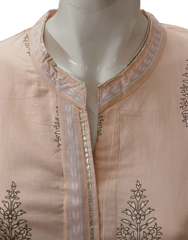 Elegant pastel Peach silver foil hand block printed kurta in beautiful floral motif, has a rounded v mandarin collar with border and silver foil around the neck and front, buttons on the front flaket under the border, three quarter straight sleeves with border on cuff, front and side slits.