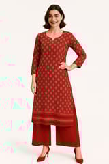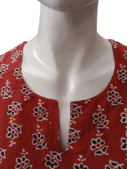 Hand Block Ajrak Red n Black floral printed kurta in cotton, round notched neck, full straight sleeve with matching borders on hem and cuff, side slits.