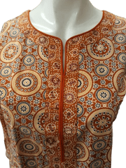 Hand block rust red printed kurta in soft cotton, round notched neck, full straight sleeve with contrast piping on neck and cuff, side slits.