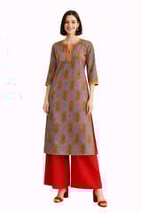 Elegant Cotton Floral grey printed kurta, has a round notched neck with loop button and contrast piping with border and gota work on the neckline, three quarter sleeves with border piping and gota on cuff, side slits.