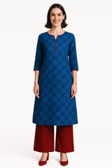 Turquoise Ikat printed kurta in handblock cotton, has a round notched neck with contrast piping, three quarter sleeves and contrast piping, side slits.