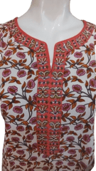 Off white and coral pastel floral hand block printed kurti, has a round notched neck with border, three quarter sleeves, side slits. Embroidery on neck and sleeves.