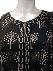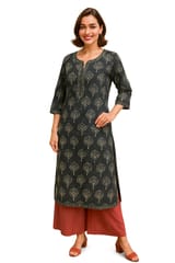 Hand Block black grey and offwhite printed kurta in soft cotton, round notched neck, 3/4 straight sleeve with matching borders on neck and cuff, side slits.