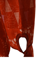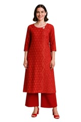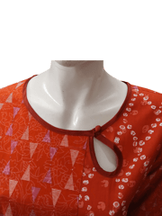 Stylish coral red cotton bandhani printed kurta with contrast piping, round loop keyhole neck with button, three quarter sleeves with contrast piping and loop keyhole with button detail on cuff, side slits.