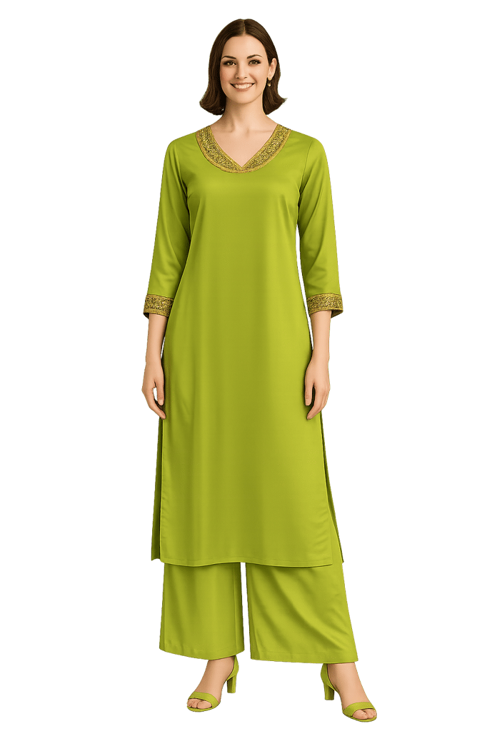 Elegant Lime Green plain kurta with rich green and gold Brocade hand embroidery and gota work on neckline, has a V neck, full sleeves with brocade hand embroidery and gota detailing on cuff, side slits.