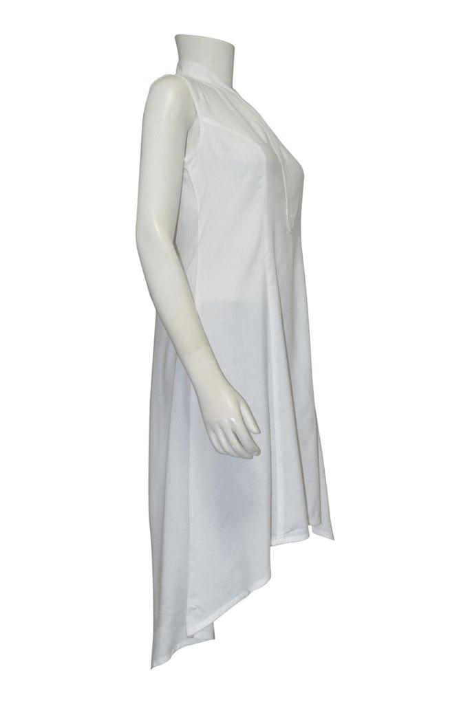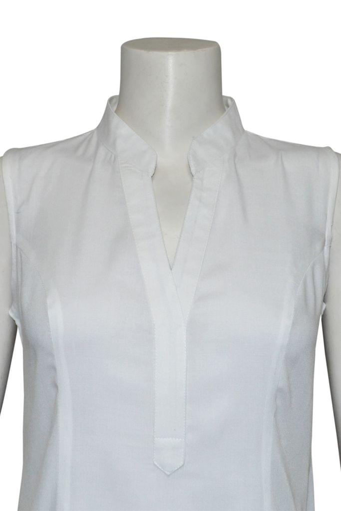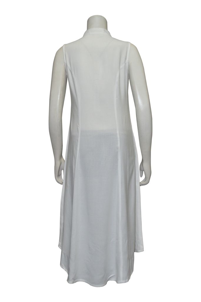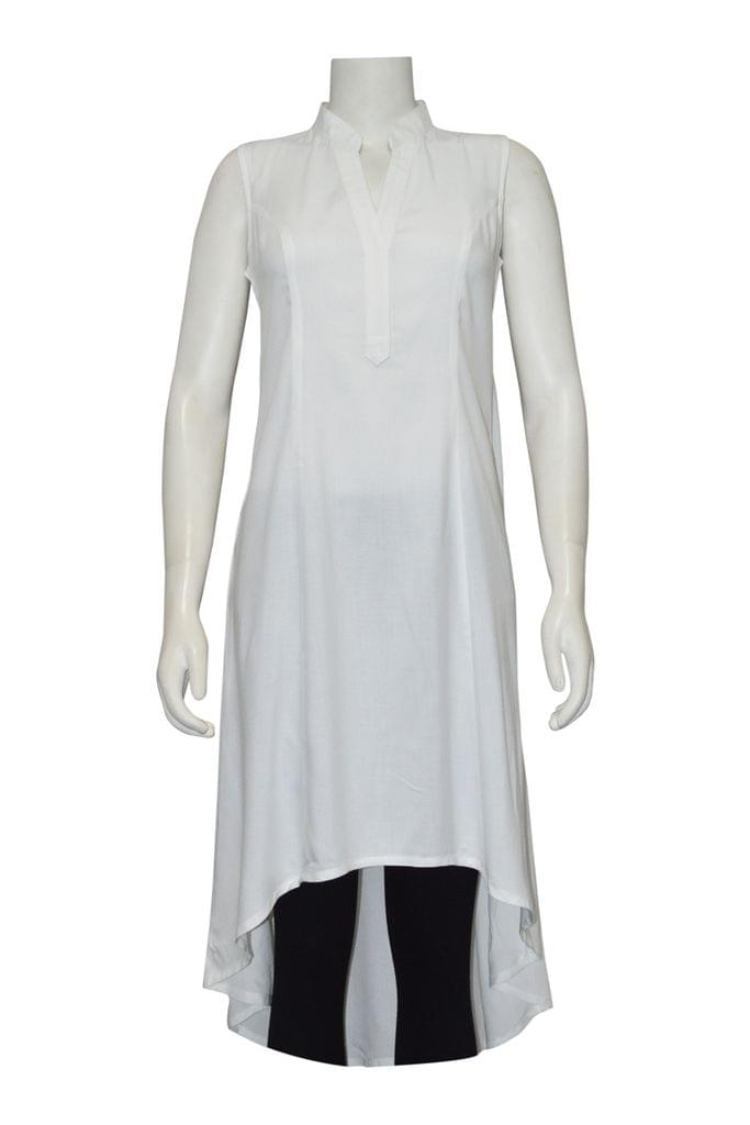 Description : Long Kurta With Asymetrical Style Cut Fabric : Very Soft Cotton-Rayon (Modal) Colour : White Neck : Open Mandarin Collar with a V Neck Sleeve : Sleeveless |