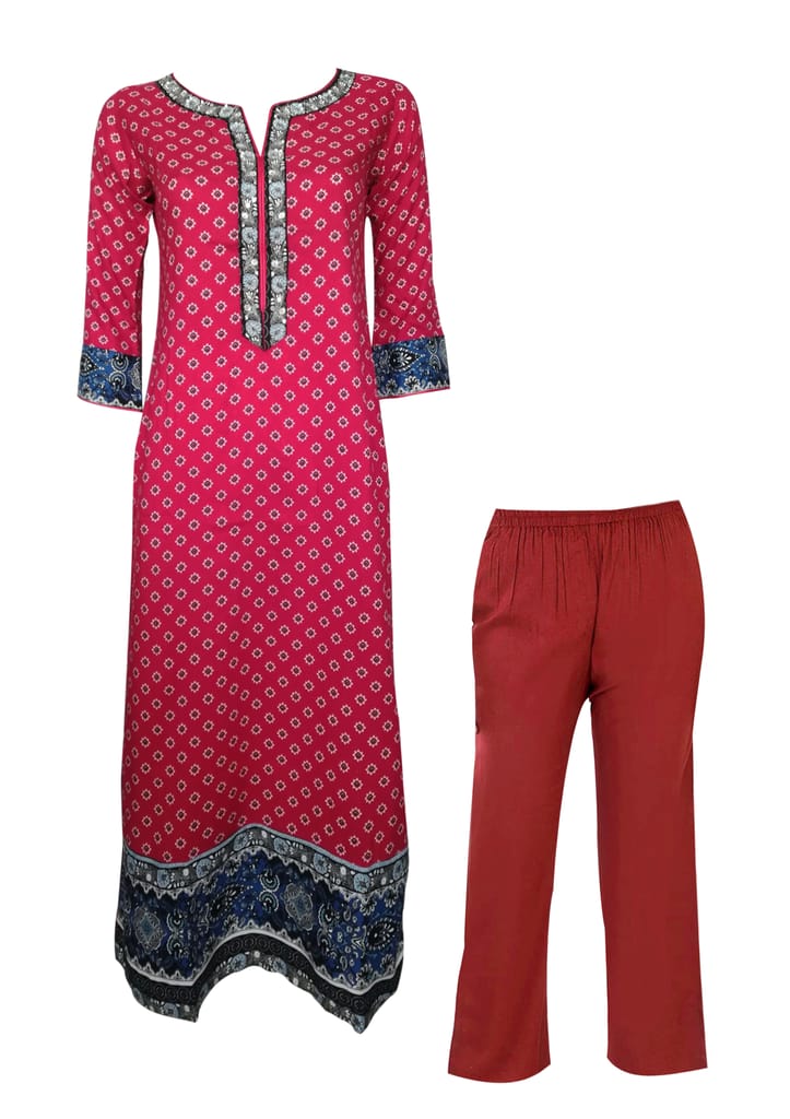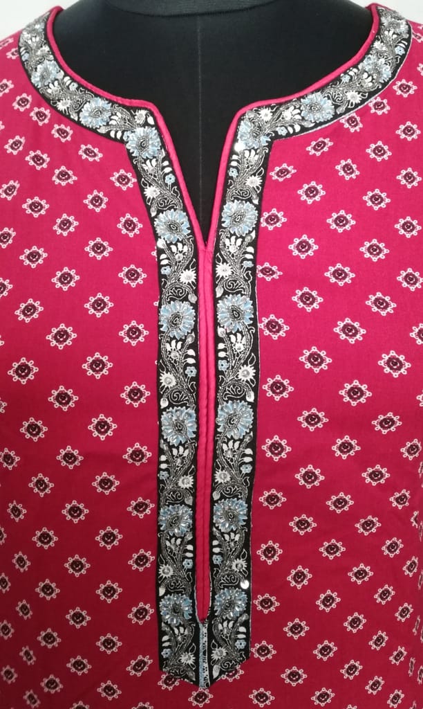 Maroon printed kurta, has a notched round neck with exquisite hand embroidery, three quarter sleeves with hand embroidery on cuff, side slits.