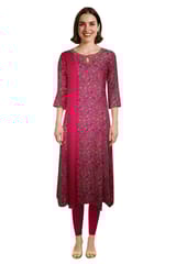 Maroon printed kurta, has a keyhole neck, three quarter sleeves, side slits.
