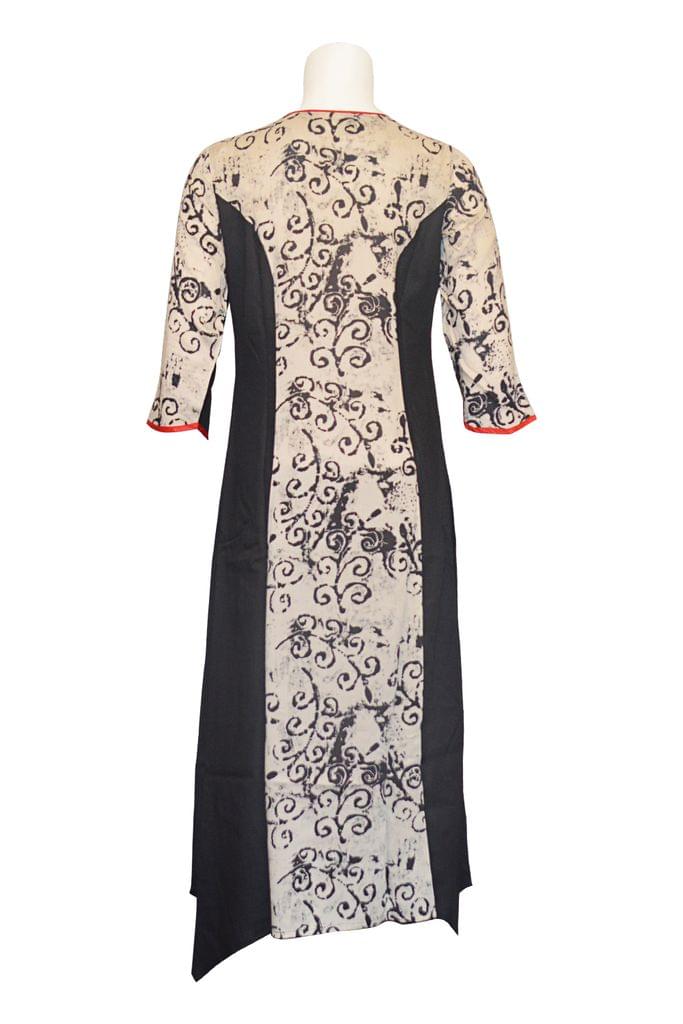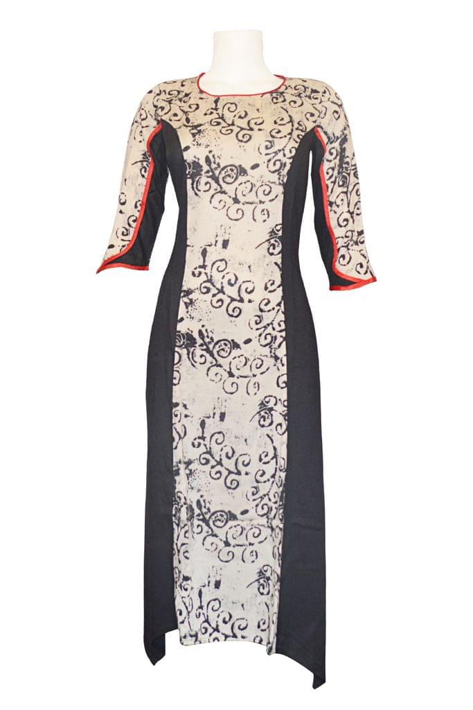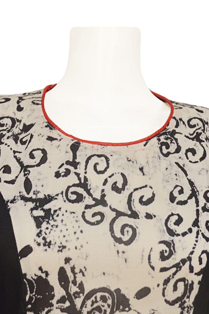 Modern black and offwhite printed long flared slightly asymmetrical gown, no side slits. Wear it as a dress or pair it with a palazzo or tights for a sophisticated modern look.