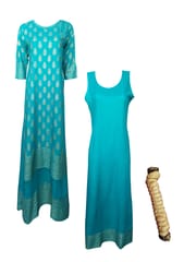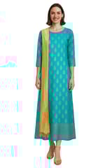Turquoise and golden foil printed kurta with turquoise plain inner kurta and dupatta (3pc set)