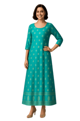 Turquoise and golden foil printed kurta, has a round neck, three quarter sleeves.