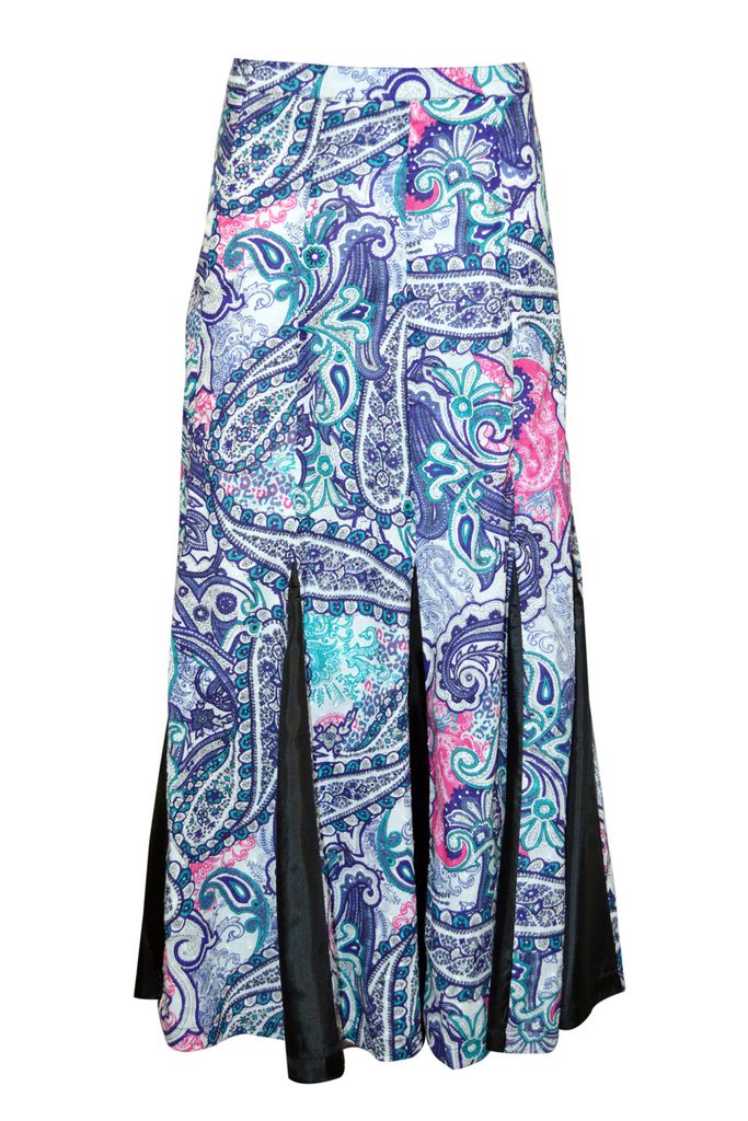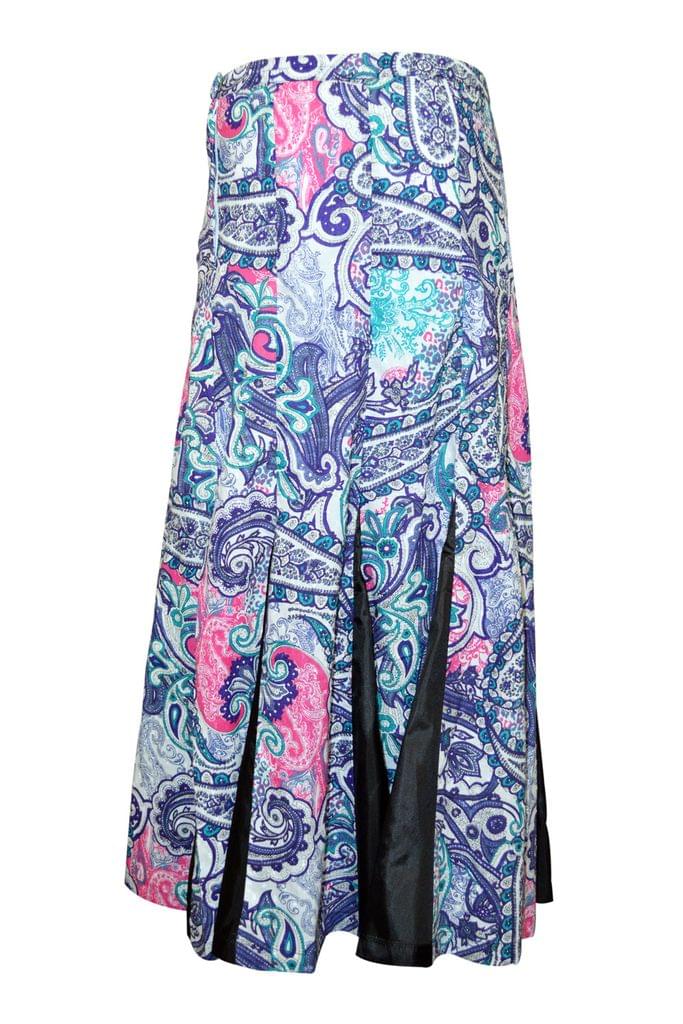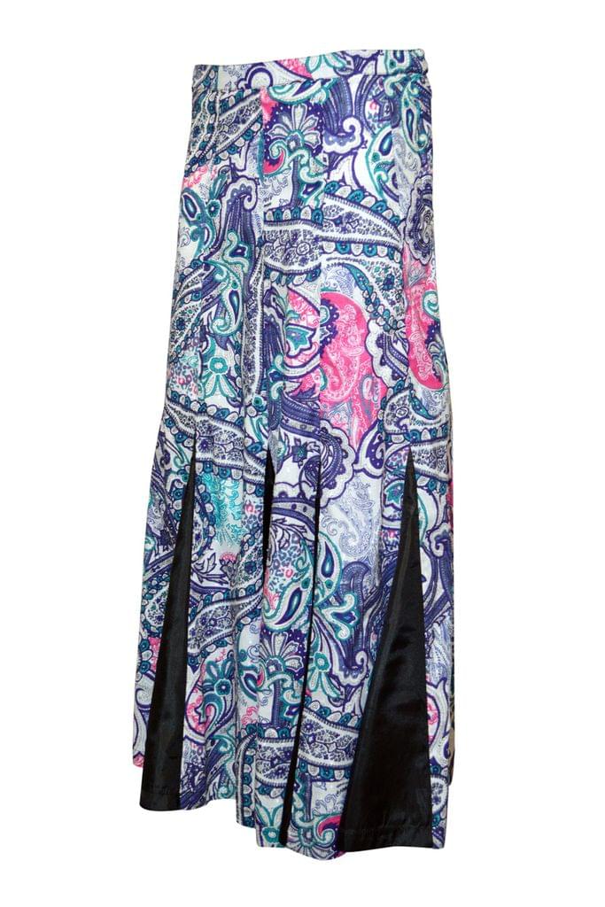 Gorgeous flare can-can style Paisley printed diva skirt with beaded tassels, has a waistband with drawstring closure, side zipper closure, and notched flared hem. Has a soft matching inner voile (mulmul) lining.
