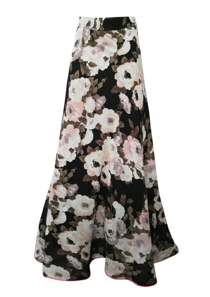 Black and white printed skirt, has a waistband with drawstring closure, side zipper closure, and flared hem.