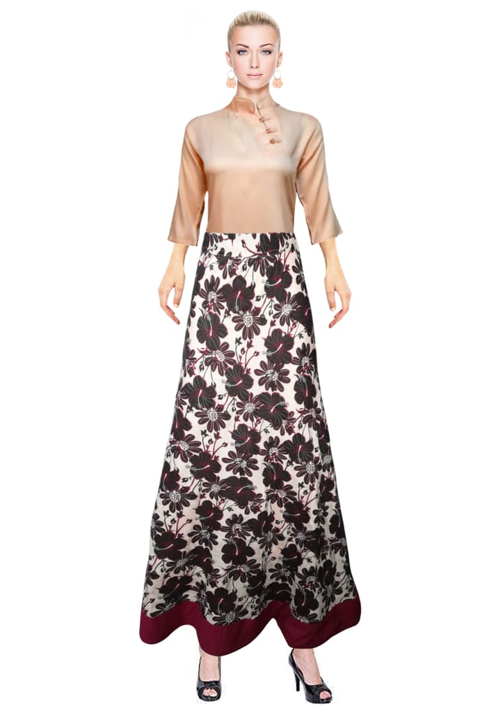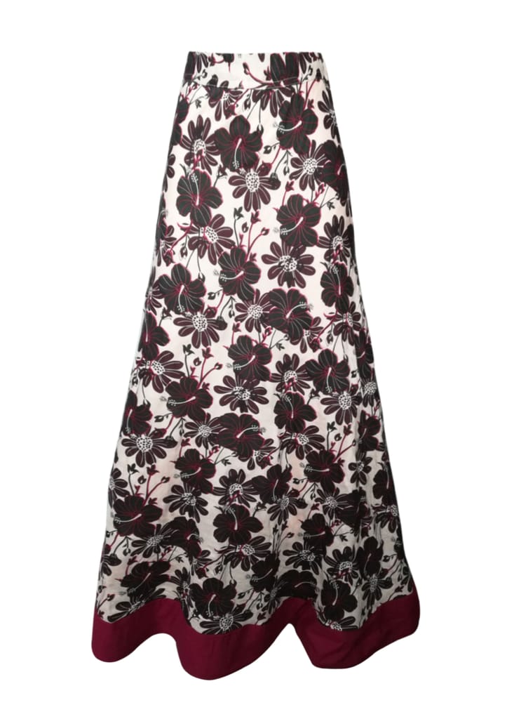 Maroon and blush pink floral printed skirt, has a waistband with drawstring closure, side zipper closure, and flared hem. Has a soft matching inner voile (mulmul) lining.